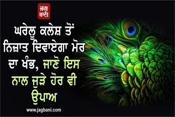 ਜੇਕਰ ਤੁਸੀਂ ਘਰ 'ਚ ਕਲੇਸ਼ ਤੋਂ ਪਰੇਸ਼ਾਨ ਹੋ ਤਾਂ ਮੋਰ ਦੇ ਖੰਭ ਨਾਲ ਜੁੜੇ ਇਹ ਵਾਸਤੂ ਟਿਪਸ ਤੁਹਾਡੇ ਲਈ ਫ਼ਾਇਦੇਮੰਦ ਹੋ ਸਕਦੇ ਹਨ। ਘਰ ਦੇ ਮੁੱਖ ਦਰਵਾਜ਼ੇ 'ਤੇ ਮੋਰ ਦੇ ਖੰਭ ਲਗਾਓ। ਮੋਰ ਦੇ ਖੰਭ ਲਗਾਉਂਦੇ ਸਮੇਂ 'ਓਮ ਦ੍ਵਾਰਪਾਲਾਯ ਨਮਹ ਜਾਗਰੇ ਸਥਾਪਯ ਸਵਾਹਾ' ਮੰਤਰ ਦਾ ਜਾਪ ਕਰੋ। ਘਰ ਦੇ ਮੁੱਖ ਦਰਵਾਜ਼ੇ 'ਤੇ ਇਸ ਮੰਤਰ ਨੂੰ ਲਿਖਣ ਨਾਲ ਘਰ ਦੇ ਕਲੇਸ਼ ਦੂਰ ਹੋਵੇਗਾ।