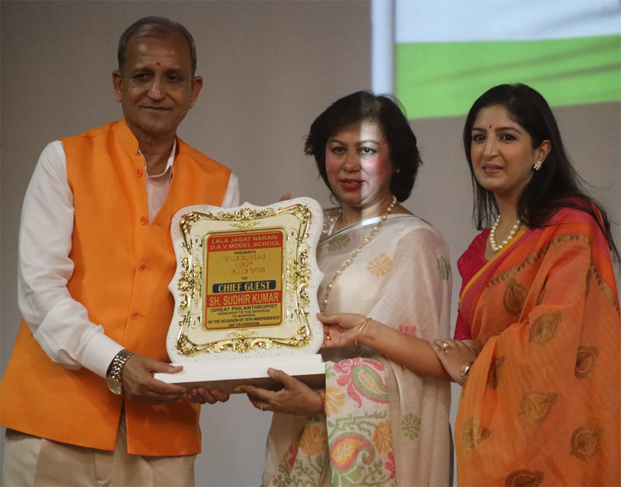 ਸ਼੍ਰੀਮਤੀ ਸਾਇਸ਼ਾ ਚੋਪੜਾ ਅਤੇ ਸੁਧੀਰ ਸ਼ਰਮਾ ਨੇ ਇਸ ਦੌਰਾਨ ਸਕੂਲ ਦੀ ਵਿਦਿਆਰਥਣ ਨੂਰਪਾਲ ਕੌਰ ਨੂੰ 12ਵੀਂ ਦੀ ਪ੍ਰੀਖਿਆ ’ਚ ਜ਼ਿਲ੍ਹੇ ’ਚੋਂ ਟਾਪ ਕਰਨ ’ਤੇ 1000 ਰੁਪਏ ਦੀ ਰਾਸ਼ੀ ਦੇ ਕੇ ਸਨਮਾਨਤ ਕਰਦੇ ਹੋਏ ਉਸ ਦੇ ਉੱਜਵਲ ਭਵਿੱਖ ਦੀ ਕਾਮਨਾ ਕੀਤੀ। ਇਸ ਦੇ ਨਾਲ ਹੀ ਉਨ੍ਹਾਂ ਸਕੂਲ ਦੇ ਹੋਰ ਹੋਣਹਾਰ ਵਿਦਿਆਰਥੀਆਂ ਨੂੰ ਵੀ ਸਨਮਾਨਤ ਕਰਦਿਆਂ ਵਧਾਈ ਦਿੱਤੀ। ਮੁੱਖ ਮਹਿਮਾਨ ਸੁਧੀਰ ਸ਼ਰਮਾ ਨੇ ਆਪਣੇ ਸੰਬੋਧਨ ’ਚ ਸਕੂਲ ਦੇ ਬੱਚਿਆਂ ਵੱਲੋਂ ਪੇਸ਼ ਕੀਤੇ ਦੇਸ਼ ਭਗਤੀ ਦੇ ਪ੍ਰੋਗਰਾਮ ਦੀ ਸ਼ਲਾਘਾ ਕੀਤੀ ਅਤੇ ਇਸ ਦਾ ਸਿਹਰਾ ਪ੍ਰਿੰ. ਅਨੀਤਾ ਨੰਦਾ ਸਮੇਤ ਸਕੂਲ ਦੇ ਅਧਿਆਪਕਾਂ ਅਤੇ ਬੱਚਿਆਂ ਦੇ ਮਾਪਿਆਂ ਨੂੰ ਦਿੱਤਾ। ਉਨ੍ਹਾਂ ਸਾਰਿਆਂ ਨੂੰ ਆਜ਼ਾਦੀ ਦਿਹਾੜੇ ਦੀ ਵਧਾਈ ਦਿੰਦੇ ਹੋਏ ਦੇਸ਼ ਦੇ ਵਿਕਾਸ ਦੇ ਕੰਮਾਂ ’ਚ ਵੱਧ ਚੜ੍ਹ ਕੇ ਹਿੱਸਾ ਲੈਣ ਦੀ ਅਪੀਲ ਕੀਤੀ।