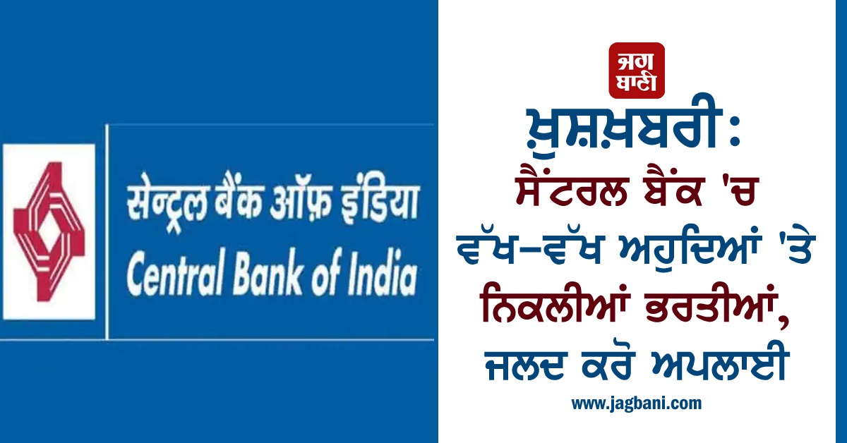 ਖ਼ੁਸ਼ਖ਼ਬਰੀ: ਸੈਂਟਰਲ ਬੈਂਕ ''ਚ ਵੱਖ-ਵੱਖ ਅਹੁਦਿਆਂ ''ਤੇ ਨਿਕਲੀਆਂ ਭਰਤੀਆਂ, ਜਲਦ ਕਰੋ ਅਪਲਾਈ