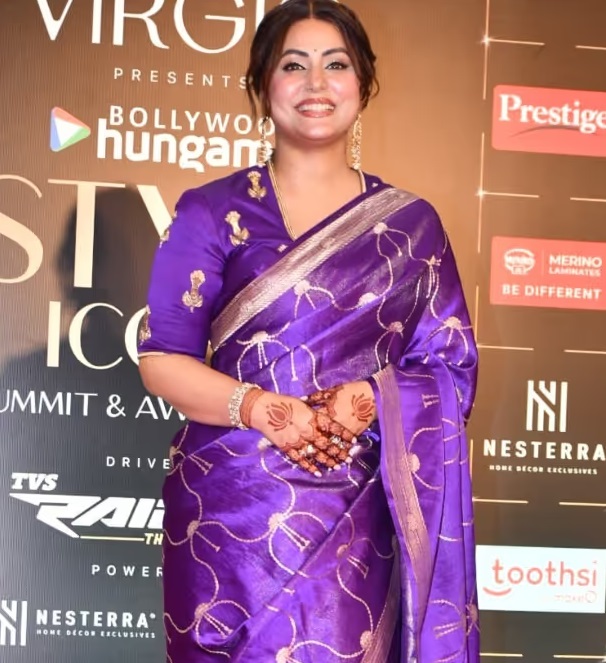 ਹਿਨਾ ਖਾਨ ਆਪਣੇ ਬੇਮਿਸਾਲ ਫੈਸ਼ਨ ਸੈਂਸ ਲਈ ਜਾਣੀ ਜਾਂਦੀ ਹੈ। ਚਾਹੇ ਰੈੱਡ ਕਾਰਪਟ ਹੋਵੇ ਜਾਂ ਰਵਾਇਤੀ ਲੁੱਕ—ਉਹ ਹਰ ਅੰਦਾਜ਼ ‘ਚ ਦਿਲ ਜਿੱਤ ਲੈਂਦੀ ਹੈ। ਇਸ ਵਾਰੀ ਉਨ੍ਹਾਂ ਨੇ ਪਰਪਲ ਸਾੜੀ ਰਾਹੀਂ ਭਾਰਤੀ ਪਰੰਪਰਾ ਨੂੰ ਗਲੇਮਰ ਨਾਲ ਜੋੜਿਆ ਅਤੇ ਇੱਕ ਪਰਫੈਕਟ ਬਰਾਈਡਲ ਲੁੱਕ ਪੇਸ਼ ਕੀਤਾ।
