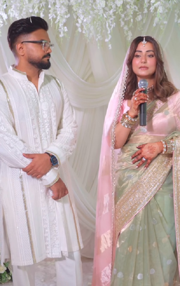 ਹਿਨਾ ਖਾਨ ਇਸ ਸਮੇਂ ਬ੍ਰੈਸਟ ਕੈਂਸਰ ਨਾਲ ਲੜ ਰਹੀ ਹੈ ਅਤੇ ਇਸ ਨਾਜ਼ੁਕ ਪਲ ਵਿੱਚ ਵੀ ਉਨ੍ਹਾਂ ਨੇ ਪਿਆਰ ਅਤੇ ਜੀਵਨ ਦੇ ਨਵੇਂ ਅਧਿਆਇ ਵਿੱਚ ਕਦਮ ਰੱਖਿਆ ਹੈ। ਵਿਆਹ ਦੀਆਂ ਤਸਵੀਰਾਂ ਤੋਂ ਬਾਅਦ ਹੁਣ ਹਿਨਾ ਖਾਨ ਨੇ ਆਪਣੇ ਵਿਆਹ ਦੀ ਵੀਡੀਓ ਸਾਂਝੀ ਕੀਤੀ ਹੈ, ਜਿਸ ਵਿਚ ਉਹ ਇਮੋਸ਼ਨਲ ਹੋ ਕੇ ਰੌਕੀ ਨੂੰ ਧੰਨਵਾਦ ਕਰਦਿਆਂ ਕਹਿੰਦੀ ਹੈ, "ਪਿਆਰ ਕਰਨਾ ਖੂਬਸੂਰਤ ਹੈ ਪਰ ਇੱਕ ਔਰਤ ਨੂੰ ਉਸ ਦੀਆਂ ਸਾਰੀਆਂ ਖਾਮੀਆਂ ਸਮੇਤ ਸਵੀਕਾਰਨਾ, ਇਸ ਦੁਨੀਆ ਦੀ ਸਭ ਤੋਂ ਵੱਡੀ ਬਲੇਸਿੰਗ ਹੈ। ਮੈਨੂੰ ਨਹੀਂ ਪਤਾ ਕੱਲ੍ਹ ਕੀ ਹੋਵੇਗਾ, ਪਰ ਤੁਸੀਂ ਮੇਰਾ ਸਾਥ ਦਿੱਤਾ। ਧੰਨਵਾਦ।"