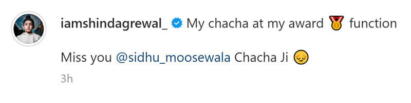 ਤਸਵੀਰਾਂ ਦੀ ਕੈਪਸ਼ਨ ’ਚ ਸ਼ਿੰਦਾ ਗਰੇਵਾਲ ਨੇ ਲਿਖਿਆ, ‘‘ਮੇਰੇ ਚਾਚਾ ਮੇਰੇ ਐਵਾਰਡ ਫੰਕਸ਼ਨ ’ਚ। ਚਾਚਾ ਜੀ ਤੁਹਾਨੂੰ ਬਹੁਤ ਯਾਦ ਕਰਦੇ ਹਾਂ।’’