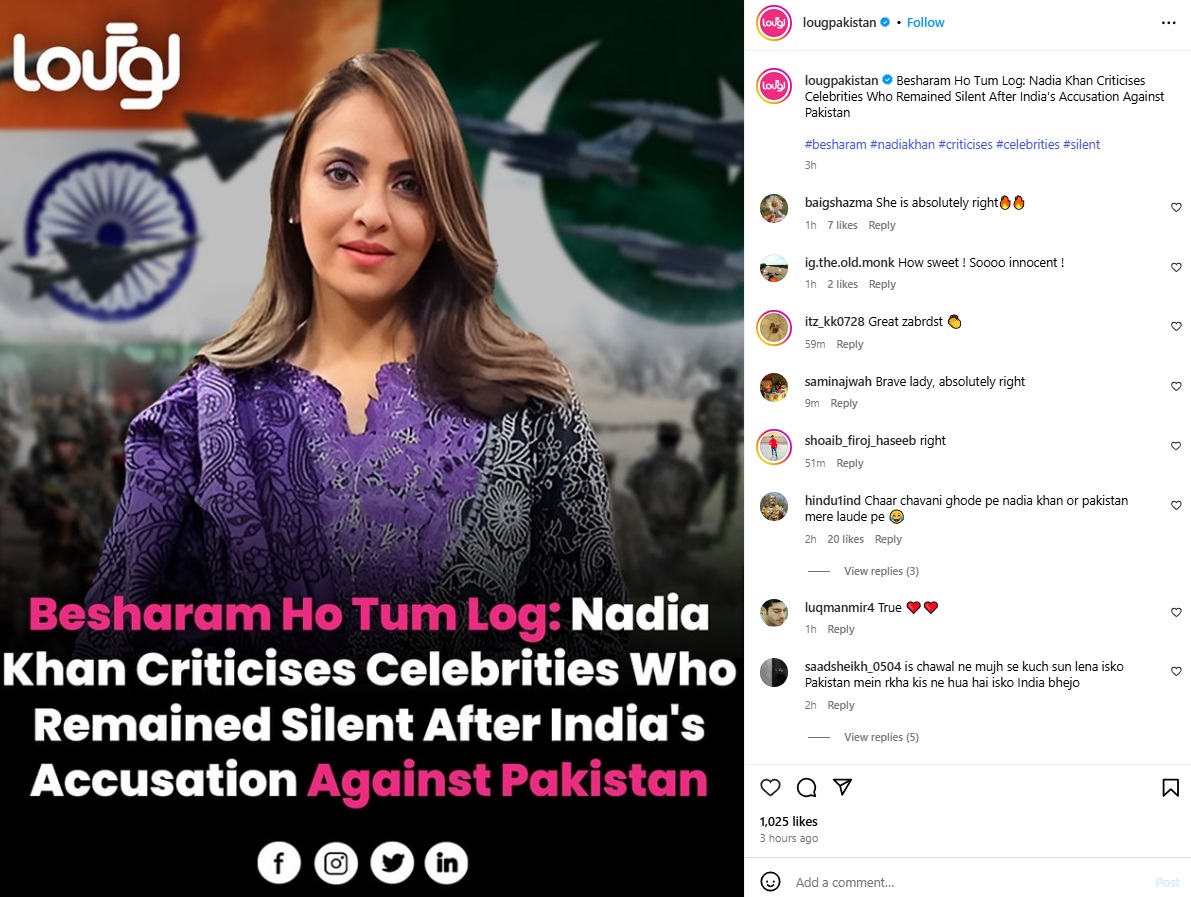 ਪਾਕਿਸਤਾਨੀ ਅਦਾਕਾਰਾ ਨਾਦੀਆ ਖਾਨ ਨੇ ਆਪਣੇ ਦੇਸ਼ ਦੇ ਕਲਾਕਾਰਾਂ ਦੀ ਚੁੱਪੀ 'ਤੇ ਨਾਰਾਜ਼ਗੀ ਜ਼ਾਹਰ ਕੀਤੀ ਹੈ। ਉਨ੍ਹਾਂ ਕਿਹਾ ਕਿ ਜਦੋਂ ਪਹਿਲਗਾਮ ਵਿੱਚ ਮਾਸੂਮ ਲੋਕਾਂ ਦੀਆਂ ਜਾਨਾਂ ਗਈਆਂ ਤਾਂ ਪਾਕਿਸਤਾਨ ਦੇ ਜ਼ਿਆਦਾਤਰ ਕਲਾਕਾਰ ਚੁੱਪ ਰਹੇ। ਨਾਦੀਆ ਨੇ ਉਨ੍ਹਾਂ ਲੋਕਾਂ ਨੂੰ 'ਬੇਸ਼ਰਮ' ਕਿਹਾ ਜੋ ਸਿਰਫ਼ ਆਪਣੇ ਫਾਇਦੇ ਲਈ ਮੁੱਦਿਆਂ 'ਤੇ ਚੁੱਪ ਰਹਿੰਦੇ ਹਨ।
