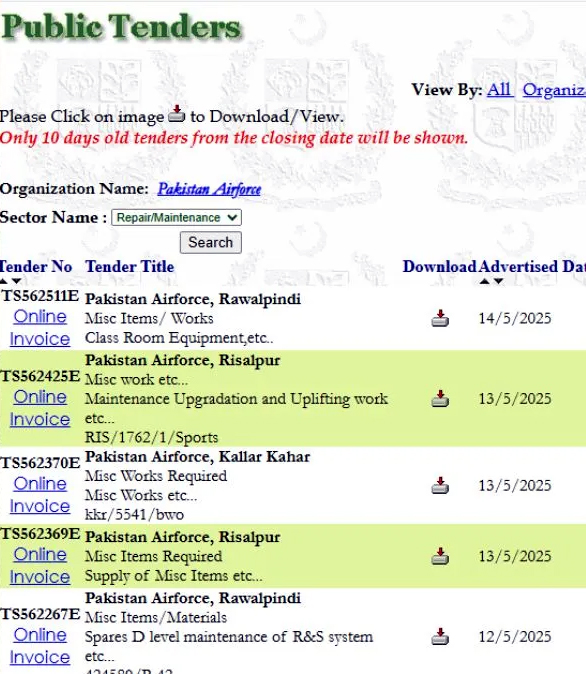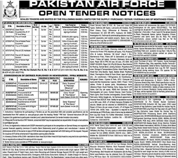 - ਪਾਕਿਸਤਾਨ ਹਵਾਈ ਸੈਨਾ ਨੇ 12 ਮਈ ਨੂੰ ਰਾਵਲਪਿੰਡੀ ਏਅਰਬੇਸ ਲਈ ਟੈਂਡਰ ਜਾਰੀ ਕੀਤਾ।
