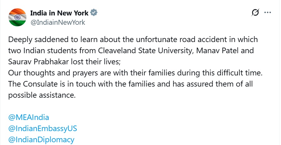 ਕੌਂਸਲੇਟ ਨੇ ਕਿਹਾ, 'ਇਸ ਮੁਸ਼ਕਲ ਸਮੇਂ ਦੌਰਾਨ ਸਾਡੀ ਹਮਦਰਦੀ ਅਤੇ ਪ੍ਰਾਰਥਨਾਵਾਂ ਉਨ੍ਹਾਂ ਦੇ ਪਰਿਵਾਰ ਨਾਲ ਹਨ। ਕੌਂਸਲੇਟ ਮ੍ਰਿਤਕਾਂ ਦੇ ਪਰਿਵਾਰਾਂ ਦੇ ਸੰਪਰਕ ਵਿੱਚ ਹੈ ਅਤੇ ਉਨ੍ਹਾਂ ਨੂੰ ਹਰ ਸੰਭਵ ਸਹਾਇਤਾ ਦਾ ਭਰੋਸਾ ਦਿੱਤਾ ਹੈ।' ਮੀਡੀਆ ਰਿਪੋਰਟਾਂ ਅਨੁਸਾਰ, ਵਿਦਿਆਰਥੀਆਂ ਦੀ ਮੌਤ ਸ਼ਨੀਵਾਰ ਸਵੇਰੇ 7 ਵਜੇ ਦੇ ਕਰੀਬ ਬ੍ਰੈਕਨੌਕ ਟਾਊਨਸ਼ਿਪ ਦੇ ਪੈਨਸਿਲਵੇਨੀਆ ਟਰਨਪਾਈਕ 'ਤੇ ਵਾਪਰੇ ਹਾਦਸੇ ਵਿੱਚ ਹੋਈ। ਲੈਂਕੈਸਟਰ ਕਾਉਂਟੀ ਕੋਰੋਨਰ ਦੇ ਦਫ਼ਤਰ ਅਤੇ ਪੈਨਸਿਲਵੇਨੀਆ ਸਟੇਟ ਪੁਲਸ ਦੇ ਅਨੁਸਾਰ, ਹਾਦਸੇ ਦੇ ਸਮੇਂ ਪ੍ਰਭਾਕਰ ਵਾਹਨ ਚਲਾ ਰਿਹਾ ਸੀ। ਪੁਲਸ ਦਾ ਕਹਿਣਾ ਹੈ ਕਿ ਗੰਭੀਰ ਸੱਟਾਂ ਕਾਰਨ ਦੋਵਾਂ ਵਿਦਿਆਰਥੀਆਂ ਦੀ ਮੌਕੇ 'ਤੇ ਹੀ ਮੌਤ ਹੋ ਗਈ।