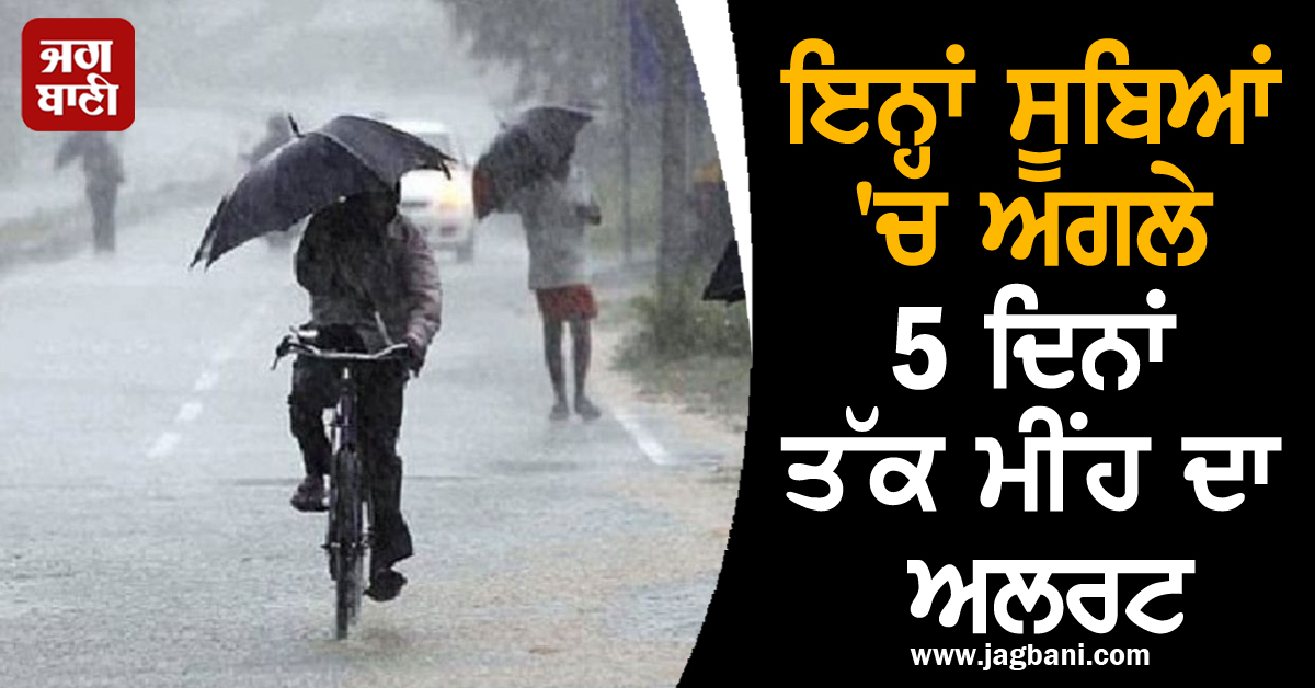 ਇਨ੍ਹਾਂ ਸੂਬਿਆਂ 'ਚ ਅਗਲੇ 5 ਦਿਨਾਂ ਤੱਕ ਮੀਂਹ ਦਾ ਅਲਰਟ, ਆਵੇਗਾ ਹਨ੍ਹੇਰੀ-ਤੂਫ਼ਾਨ