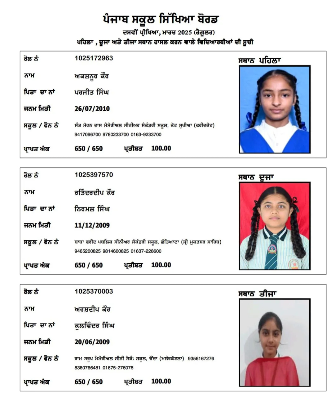 10ਵੀਂ ਦੇ ਨਤੀਜਿਆਂ 'ਚ ਪਹਿਲੇ ਤਿੰਨ ਸਥਾਨਾਂ 'ਤੇ ਕੁੜੀਆਂ, ਤਿੰਨਾਂ ਦੇ ਨੰਬਰ 650 'ਚੋਂ 650