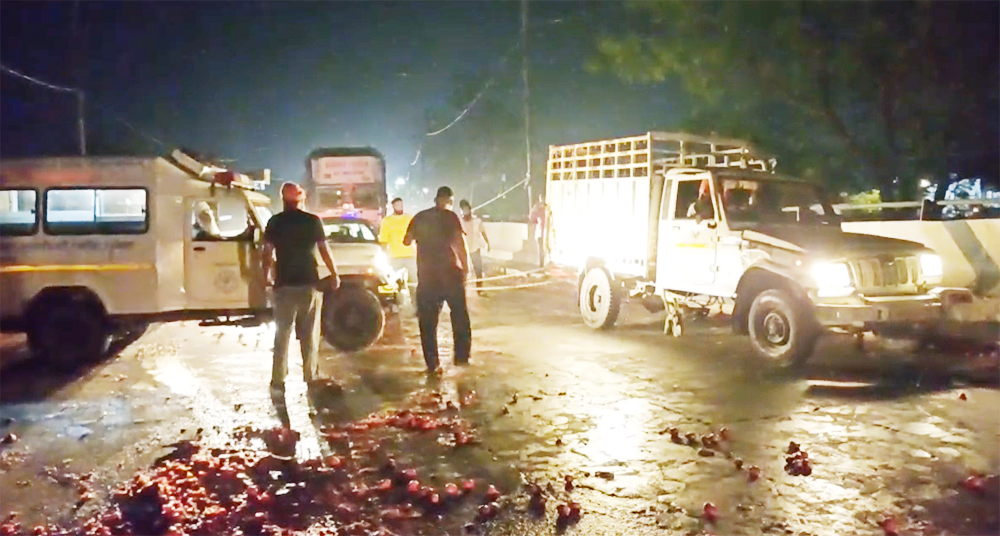 ਮੋਗਾ (ਕਸ਼ਿਸ਼ ਸਿੰਗਲਾ) : ਮੋਗਾ ਦੇ ਕੋਟਕਪੂਰਾ ਬਾਈਪਾਸ ਨੇੜੇ ਇਕ ਟਮਾਟਰ ਪਿਕਅਪ ਗੱਡੀ ਜੋ ਫੁਲੇ ਵਾਲਾ ਤੋਂ ਜਲੰਧਰ ਨੂੰ ਜਾ ਰਹੀ ਸੀ ਦਾ ਅਚਾਨਕ ਟਾਇਰ ਫਟ ਗਿਆ ਅਤੇ ਸੰਤੁਲਨ ਵਿਗੜਣ ਕਾਰਨ ਸੜਕ 'ਤੇ ਹੀ ਪਲਟ ਗਈ। ਹਾਦਸੇ ਕਾਰਣ ਸੜਕ 'ਤੇ ਟਮਾਟਰ ਖਿੱਲਰ ਗਏ। ਉਸ ਤੋਂ ਬਾਅਦ ਮੋਗਾ ਦੇ ਸਮਾਜ ਸੇਵਾ ਸੋਸਾਇਟੀ ਦੇ ਆਗੂਆਂ ਵੱਲੋਂ ਮੌਕੇ 'ਤੇ ਪਹੁੰਚ ਕੇ ਡਰਾਈਵਰ ਨੂੰ ਪਿਕਅਪ ਵਿਚੋਂ ਬਾਹਰ ਕੱਢ ਕੇ ਸਿਵਲ ਹਸਪਤਾਲ ਵਿਚ ਦਾਖਲ ਕਰਵਾਇਆ ਗਿਆ ਅਤੇ ਫਾਇਰ ਬ੍ਰਿਗੇਡ ਦੇ ਸਹਿਯੋਗ ਨਾਲ ਖਿੱਲਰੇ ਹੋਏ ਟਮਾਟਰਾਂ ਨੂੰ ਸੜਕ ਤੋਂ ਸਾਈਡ 'ਤੇ ਕੀਤਾ ਗਿਆ। ਹਾਦਸੇ ਕਾਰਣ ਸੜਕ 'ਤੇ ਲੰਬਾ ਜਾਮ ਲੱਗ ਗਿਆ।