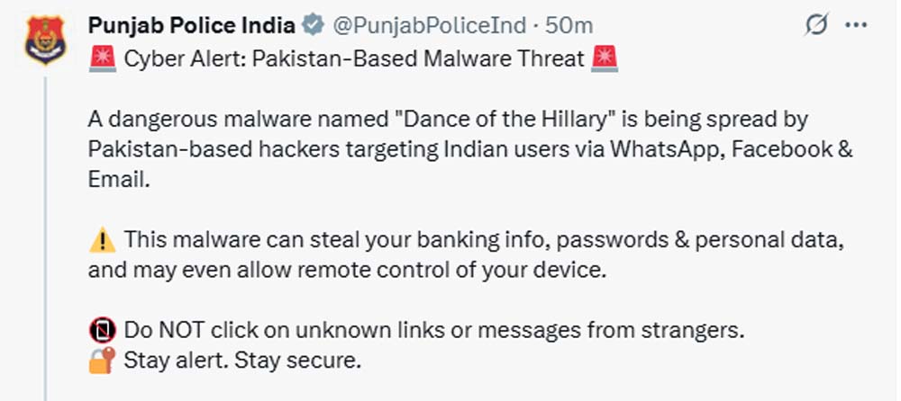 ਚੰਡੀਗੜ੍ਹ : ਭਾਰਤ-ਪਾਕਿਸਤਾਨ ਵਿਚਾਲੇ ਬਣੇ ਜੰਗ ਦੇ ਮਾਹੌਲ ਤੋਂ ਬਾਅਦ ਭਾਵੇਂ ਸੀਜ਼ਫਾਇਰ ਹੋ ਗਿਆ ਹੈ ਅਤੇ ਦੋਵਾਂ ਦੇਸ਼ਾਂ ਨੇ ਗੋਲੀਬਾਰੀ ਅਤੇ ਪੂਰੀ ਤਰ੍ਹਾਂ ਰੋਕ ਲਗਾ ਦਿੱਤੀ ਹੈ ਪਰ ਹੁਣ ਪੰਜਾਬ ਪੁਲਸ ਨੇ ਅਲਰਟ ਜਾਰੀ ਕੀਤਾ ਹੈ। ਇਹ ਅਲਰਟ ਸਾਈਬਰ ਅਟੈਕ ਨੂੰ ਲੈ ਕੇ ਕੀਤਾ ਗਿਆ ਹੈ। ਦਰਅਸਲ ਪੰਜਾਬ ਪੁਲਸ ਨੇ ਟਵਿੱਟਰ 'ਤੇ ਕਿਹਾ ਹੈ ਕਿ 'ਸਾਈਬਰ ਅਲਰਟ: ਪਾਕਿਸਤਾਨ ਆਧਾਰਿਤ ਮਾਲਵੇਅਰ ਖ਼ਤਰਾ'। "Dance of the Hillary" ਨਾਂ ਵਾਲਾ ਇਕ ਖ਼ਤਰਨਾਕ ਮਾਲਵੇਅਰ ਪਾਕਿਸਤਾਨ ਆਧਾਰਤ ਹੈਕਰਾਂ ਵੱਲੋਂ ਭਾਰਤੀ ਯੂਜ਼ਰਾਂ ਨੂੰ ਵਟਸਐਪ, ਫੇਸਬੁੱਕ ਅਤੇ ਈ-ਮੇਲ ਰਾਹੀਂ ਭੇਜਿਆ ਜਾ ਰਿਹਾ ਹੈ।