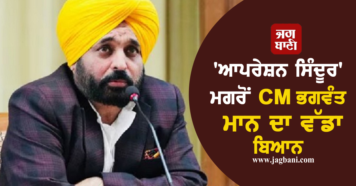 ਚੰਡੀਗੜ੍ਹ : ਭਾਰਤ ਵਲੋਂ ਅੱਤਵਾਦ ਦੇ ਖ਼ਿਲਾਫ਼ 'ਆਪਰੇਸ਼ਨ ਸਿੰਦੂਰ' ਤਹਿਤ ਭਾਰਤੀ ਫ਼ੌਜੀਆਂ ਨੇ ਪਾਕਿਸਤਾਨ ਸਥਿਤ ਅੱਤਵਾਦੀ ਟਿਕਾਣਿਆਂ 'ਤੇ ਹਮਲਾ ਕਰ ਦਿੱਤਾ। ਇਸ ਨੂੰ ਲੈ ਕੇ ਮੁੱਖ ਮੰਤਰੀ ਭਗਵੰਤ ਮਾਨ ਦਾ ਵੱਡਾ ਬਿਆਨ ਸਾਹਮਣੇ ਆਇਆ ਹੈ।