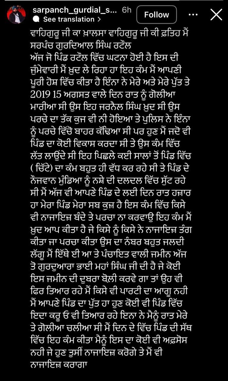 ਭਜੀਤੇ ਦਾ ਕਤਲ ਕਰ ਸਾਬਕਾ ਸਰਪੰਚ ਨੇ ਪੋਸਟ ਪਾ ਕੇ ਲਈ ਜ਼ਿੰਮੇਵਾਰੀ, ਕਿਹਾ- ਮੈਨੂੰ ਕੋਈ ਅਫ਼ਸੋਸ ਨਹੀਂ