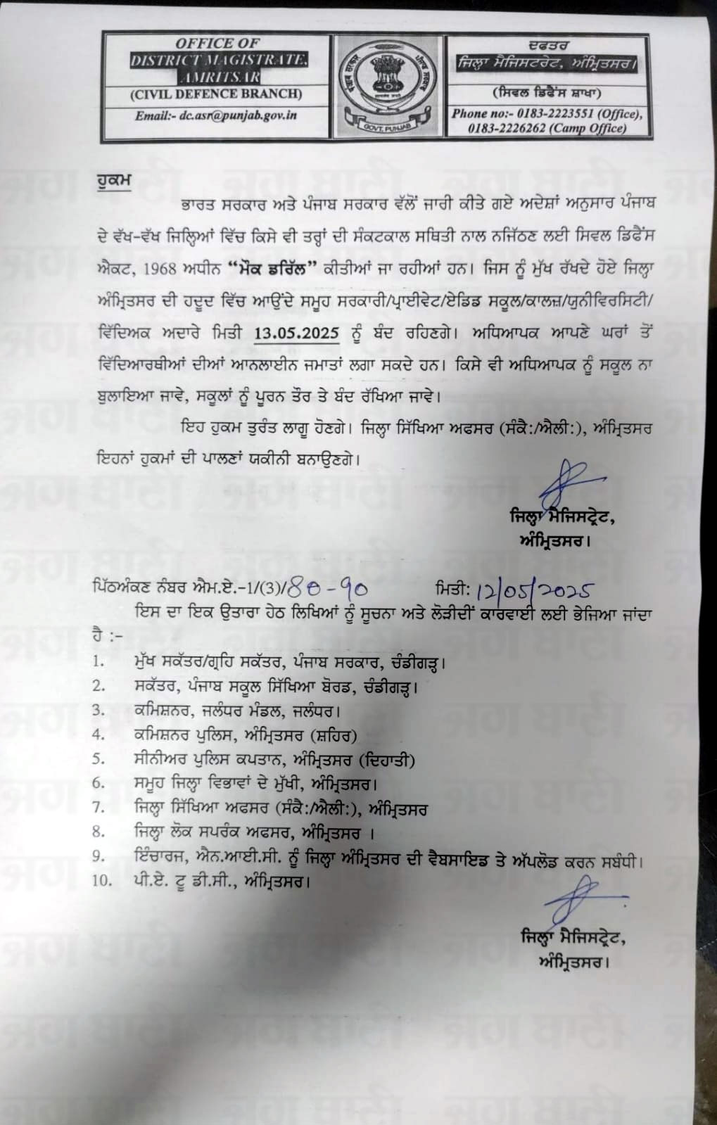 ਉਧਰ ਅੰਮ੍ਰਿਤਸਰ ਵਿੱਚ ਵੀ ਅਹਿਤੀਆਤ ਵਜੋਂ ਸਕੂਲ-ਕਾਲਜਾ ਨੂੰ ਬੰਦ ਰੱਖਣ ਦਾ ਫੈਸਲਾ ਲਿਆ ਗਿਆ ਹੈ। ਅੰਮ੍ਰਿਤਸਰ ਵਿੱਚ ਕੱਲ ਨੂੰ ਸਕੂਲ ਬੰਦ ਰਹਿਣਗੇ। ਅੰਮ੍ਰਿਤਸਰ ਦੇ ਡੀਸੀ ਵਲੋਂ ਜਾਰੀ ਹੁਕਮਾਂ ਮੁਤਾਬਕ 13 ਮਈ ਨੂੰ ਮੌਕ ਡ੍ਰਿਲ ਕੀਤੀ ਜਾਣੀ ਹੈ, ਜਿਸ ਕਾਰਨ ਜ਼ਿਲਾ ਪ੍ਰਸ਼ਾਸਨ ਵਲੋਂ ਸਾਰੇ ਵਿਦਿਅਕ ਅਦਾਰਿਆਂ ਨੂੰ ਬੰਦ ਰੱਖਣ ਦਾ ਫੈਸਲਾ ਲਿਆ ਗਿਆ।