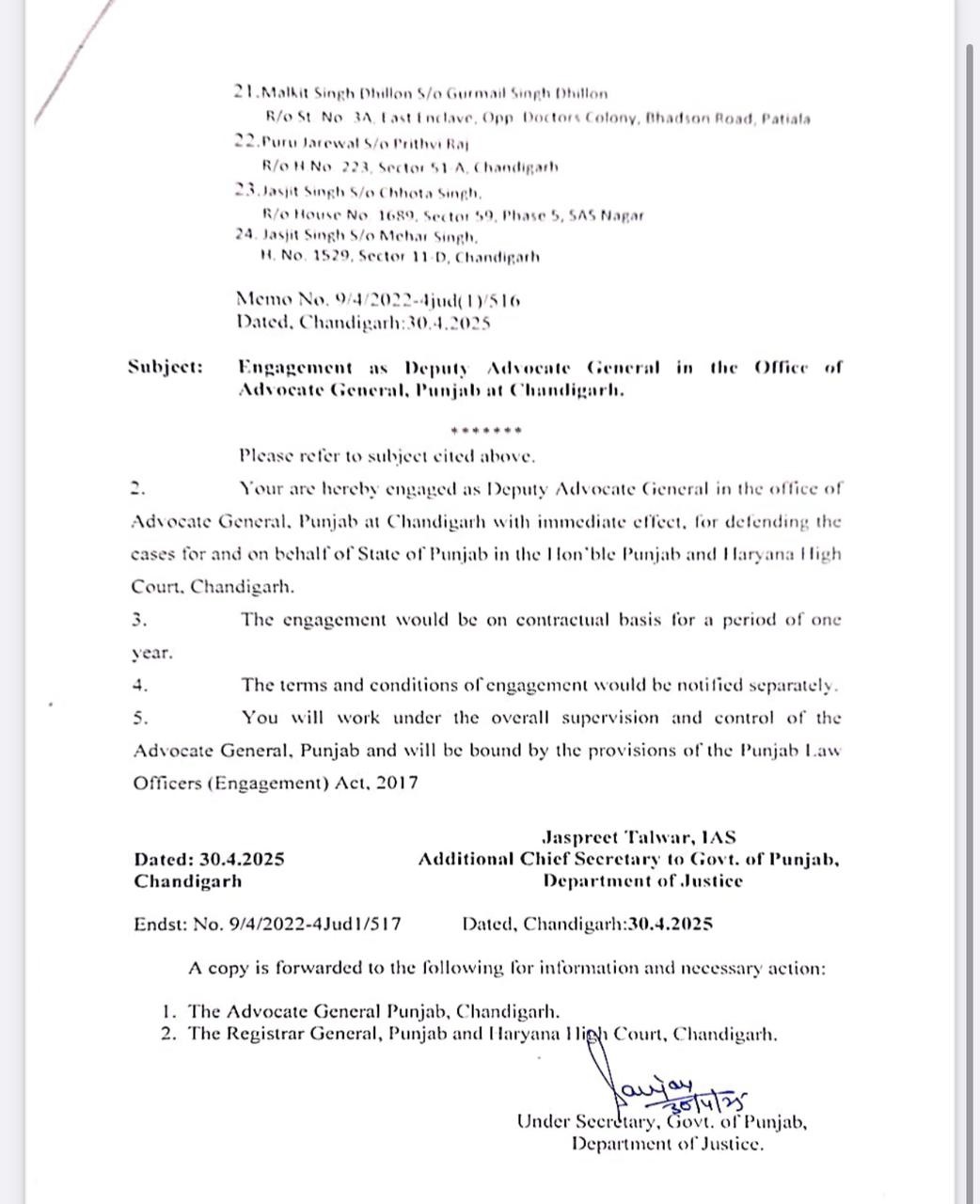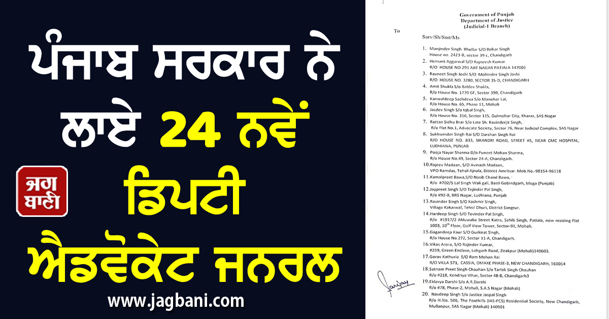 ਵੱਡੀ ਖਬਰ! ਪੰਜਾਬ ਸਰਕਾਰ ਨੇ ਲਾਏ 24 ਨਵੇਂ ਡਿਪਟੀ ਐਡਵੋਕੇਟ ਜਨਰਲ, ਦੇਖੋ ਲਿਸਟ