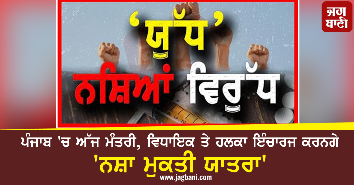 ਜਲੰਧਰ (ਵੈੱਬ ਡੈਸਕ)- ਯੁੱਧ ਨਸ਼ਿਆਂ ਵਿਰੁੱਧ ਮੁਹਿੰਮ ਤਹਿਤ ਪੰਜਾਬ ਸਰਕਾਰ ਵੱਲੋਂ ਸ਼ੁਰੂ ਕੀਤੀ ਗਈ ਨਸ਼ਾ ਮੁਕਤੀ ਯਾਤਰਾ ਦੌਰਾਨ ਅੱਜ ਪੰਜਾਬ ਵਿਚ ਮੰਤਰੀ, ਵਿਧਾਇਕ ਅਤੇ ਇਲਾਕਾ ਇੰਚਾਰਜਾਂ ਵੱਲੋਂ 'ਨਸ਼ਾ ਮੁਕਤੀ ਯਾਤਰਾ' ਕੀਤੀ ਜਾਵੇਗੀ। ਹਰੇਕ ਵਿਧਾਨ ਸਭਾ ਹਲਕੇ ਦੀਆਂ ਤਿੰਨ ਗ੍ਰਾਮ ਪੰਚਾਇਤਾਂ/ਵਾਰਡਾਂ ਵਿੱਚ ਇਹ ਨਸ਼ਾ ਮੁਕਤੀ ਦੀ ਯਾਤਰਾ ਕੱਢੀ ਜਾਵੇਗੀ। ਮੰਤਰੀ ਕੁਲਦੀਪ ਸਿੰਘ ਧਾਲੀਵਾਲ ਅਜਨਾਲਾ ਹਲਕੇ ਵਿੱਚ ਨਸ਼ਾ ਮੁਕਤੀ ਯਾਤਰਾ ਦਾ ਆਯੋਜਨ ਕਰਨਗੇ।