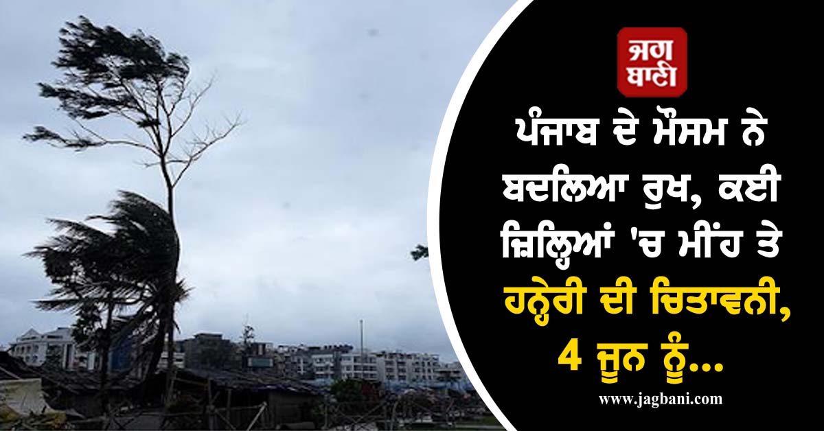 ਪੰਜਾਬ ਦੇ ਮੌਸਮ ਨੇ ਬਦਲਿਆ ਰੁਖ, ਕਈ ਜ਼ਿਲ੍ਹਿਆਂ ''ਚ ਮੀਂਹ ਤੇ ਹਨ੍ਹੇਰੀ ਦੀ ਚਿਤਾਵਨੀ, 4 ਜੂਨ ਨੂੰ...
