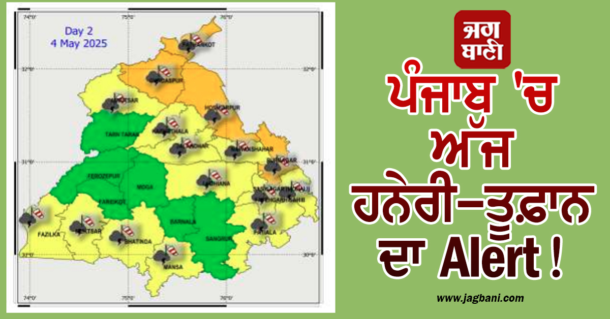 ਭਾਰਤ ਮੌਸਮ ਵਿਗਿਆਨ ਕੇਂਦਰ ਵੱਲੋਂ 9 ਮਈ ਤਕ ਸੂਬੇ ਵਿਚ ਹਨੇਰੀ ਦੇ ਨਾਲ ਬਾਰਿਸ਼ ਦੀ ਭਵਿੱਖਬਾਣੀ ਕੀਤੀ ਗਈ ਹੈ। ਇਸ ਦੇ ਨਾਲ ਹੀ ਅੱਜ ਅਤੇ ਕੱਲ੍ਹ ਲਈ ਵਿਭਾਗ ਨੇ ਕਈ ਜ਼ਿਲ੍ਹਿਆਂ 'ਚ ਓਰੇਂਜ ਤਾਂ ਕਈਆਂ ਲਈ ਯੈਲੋ ਅਲਰਟ ਜਾਰੀ ਕੀਤਾ ਹੈ। ਵਿਭਾਗ ਵੱਲੋਂ ਅੱਜ ਸੂਬੇ ਭਰ ਵਿਚ ਹਲਕੀ ਬਾਰਿਸ਼ ਦੀ ਸੰਭਾਵਨਾ ਜਤਾਈ ਗਈ ਹੈ। ਪਠਾਨਕੋਟ, ਗੁਰਦਾਸਪੁਰ ਅਤੇ ਹੁਸ਼ਿਆਰਪੁਰ ਵਿਚ ਮੀਂਹ ਦੇ ਨਾਲ-ਨਾਲ ਹਨੇਰੀ-ਤੂਫ਼ਾਨ ਲਈ ਓਰੇਂਜ ਅਲਰਟ ਜਾਰੀ ਕੀਤਾ ਗਿਆ ਹੈ। ਇਸ ਦੇ ਨਾਲ ਹੀ ਅੰਮ੍ਰਿਤਸਰ, ਨਵਾਂਸ਼ਹਿਰ, ਕਪੂਰਥਲਾ, ਜਲੰਧਰ, ਫਾਜ਼ਿਲਕਾ, ਮੁਕਤਸਰ, ਬਠਿੰਡਾ, ਲੁਧਿਆਣਾ, ਮਾਨਸਾ, ਫ਼ਤਹਿਗੜ੍ਹ ਸਾਹਿਬ, ਪਟਿਆਲਾ ਅਤੇ ਮਾਲੇਰਕੋਟਲਾ ਲਈ ਯੈਲੋ ਅਲਰਟ ਜਾਰੀ ਕੀਤਾ ਗਿਆ ਹੈ।