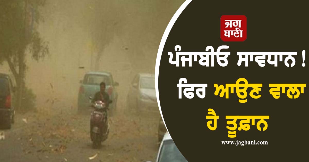 ਚੰਡੀਗੜ੍ਹ : ਪੰਜਾਬ ਵਾਸੀਆਂ ਨੂੰ ਸਾਵਧਾਨ ਰਹਿਣ ਦੀ ਲੋੜ ਹੈ। ਦਰਅਸਲ ਸੂਬੇ 'ਚ ਇਕ ਵਾਰ ਫਿਰ ਭਾਰੀ ਤੂਫ਼ਾਨ ਆਉਣ ਵਾਲਾ ਹੈ। ਮੌਸਮ ਵਿਭਾਗ ਦੇ ਮੁਤਾਬਕ ਸੂਬੇ ਦੇ ਕਈ ਜ਼ਿਲ੍ਹਿਆਂ 'ਚ ਅੱਜ ਭਾਰੀ ਤੂਫ਼ਾਨ ਦੇ ਨਾਲ-ਨਾਲ ਮੀਂਹ ਦਾ ਵੀ ਅਲਰਟ ਜਾਰੀ ਕੀਤਾ ਗਿਆ ਹੈ।