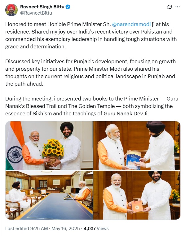 ਕੇਂਦਰੀ ਮੰਤਰੀ ਰਵਨੀਤ ਬਿੱਟੂ ਨੇ ਕਿਹਾ,''ਪ੍ਰਧਾਨ ਮੰਤਰੀ ਨਾਲ ਉਨ੍ਹਾਂ ਨਾਲ ਘਰ ਮੁਲਾਕਾਤ ਕਰ ਕੇ ਮਾਣ ਮਹਿਸੂਸ ਕਰ ਰਿਹਾ ਹਾਂ। ਪਾਕਿਸਤਾਨ 'ਤੇ ਭਾਰਤ ਦੀ ਹਾਲੀਆ ਜਿੱਤ 'ਤੇ ਆਪਣੀ ਖ਼ੁਸ਼ੀ ਸਾਂਝੀ ਕੀਤੀ ਅਤੇ ਕਠਿਨ ਸਥਿਤੀਆਂ ਨੂੰ ਸ਼ਾਲੀਨਤਾ ਅਤੇ ਦ੍ਰਿੜ ਸੰਕਲਪ ਨਾਲ ਸੰਭਾਲਣ 'ਚ ਉਨ੍ਹਾਂ ਦੀ ਅਗਵਾਈ ਦੀ ਸ਼ਲਾਘਾ ਕੀਤੀ। ਪੰਜਾਬ ਦੇ ਵਿਕਾਸ ਲਈ ਮੁੱਖ ਪਹਿਲੂਆਂ 'ਤੇ ਚਰਚਾ ਕੀਤੀ।'' ਬਿੱਟੂ ਨੇ ਕਿਹਾ,''ਪ੍ਰਧਾਨ ਮੰਤਰੀ ਨਾਲ ਪੰਜਾਬ ਦੇ ਵਿਕਾਸ ਅਤੇ ਉੱਨਤੀ ਲਈ ਕਈ ਮੁੱਦਿਆਂ 'ਤੇ ਚਰਚਾ ਕੀਤੀ ਗਈ।'' ਇਸ ਦੌਰਾਨ ਰਵਨੀਤ ਬਿੱਟੂ ਨੇ ਪੀ.ਐੱਮ. ਮੋਦੀ ਨੂੰ ਪੰਜਾਬ 'ਚ ਮੌਜੂਦਾ ਧਾਰਮਿਕ ਅਤੇ ਰਾਜਨੀਤਕ ਮਾਹੌਲ ਤੋਂ ਜਾਣੂ ਕਰਵਾਇਆ ਅਤੇ ਅੱਗੇ ਦੀ ਰਣਨੀਤੀ ਨੂੰ ਲੈ ਕੇ ਚਰਚਾ ਕੀਤੀ। ਬੈਠਕ ਦੌਰਾਨ ਬਿੱਟੂ ਨੇ ਪੀ.ਐੱਮ. ਮੋਦੀ ਨੂੰ 2 ਕਿਤਾਬਾਂ ਤੋਹਫ਼ੇ ਵਜੋਂ ਦਿੱਤੀਆਂ। ਜਿਸ 'ਚ ਸ੍ਰੀ ਗੁਰੂ ਨਾਨਕ ਬਲੈੱਸਡ ਟ੍ਰੇਲ ਅਤੇ ਦਿ ਗੋਲਡਨ ਟੈਂਪਲ ਸ਼ਾਮਲ ਹਨ। ਦੋਵੇਂ ਹੀ ਸਿੱਖ ਧਰਮ ਦੇ ਸਾਰ ਅਤੇ ਗੁਰੂ ਨਾਨਕ ਦੇਵ ਜੀ ਦੀਆਂ ਸਿੱਖਿਆਵਾਂ ਦਾ ਪ੍ਰਤੀਕ ਹਨ।