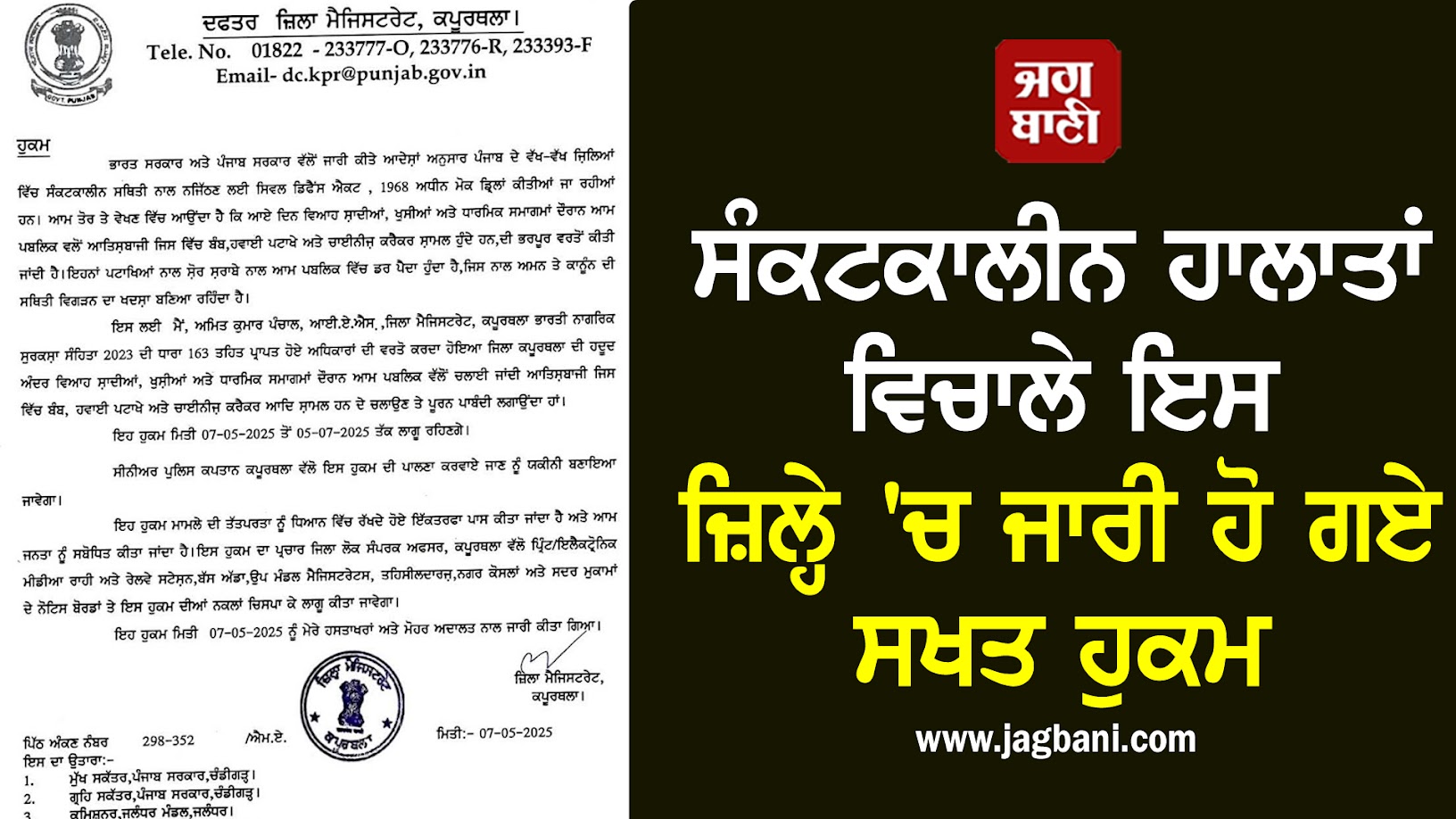 ਇਸ ਲਈ ਅਮਿਤ ਕੁਮਾਰ ਪੰਚਾਲ, ਆਈ.ਏ.ਐੱਸ.,ਜ਼ਿਲ੍ਹਾ ਮੈਜਿਸਟਰੇਟ ਕਪੂਰਥਲਾ ਨੇ ਭਾਰਤੀ ਨਾਗਰਿਕ ਸੁਰਕਸ਼ਾ ਸੰਹਿਤਾ 2023 ਦੀ ਧਾਰਾ 163 ਤਹਿਤ ਪ੍ਰਾਪਤ ਹੋਏ ਅਧਿਕਾਰਾਂ ਦੀ ਵਰਤੋ ਕਰਦਿਆਂ ਜ਼ਿਲ੍ਹਾ ਕਪੂਰਥਲਾ ਦੀ ਹਦੂਦ ਅੰਦਰ ਵਿਆਹ ਸ਼ਾਦੀਆਂ, ਖੁਸ਼ੀਆਂ ਅਤੇ ਧਾਰਮਿਕ ਸਮਾਗਮਾਂ ਦੌਰਾਨ ਆਮ ਪਬਲਿਕ ਵੱਲੋਂ ਚਲਾਈ ਜਾਂਦੀ ਆਤਿਸ਼ਬਾਜੀ ਜਿਸ ਵਿੱਚ ਬੰਬ, ਹਵਾਈ ਪਟਾਖੇ ਅਤੇ ਚਾਈਨੀਜ਼ ਕਰੈਕਰ ਆਦਿ ਸ਼ਾਮਲ ਹਨ ਦੇ ਚਲਾਉਣ 'ਤੇ ਪੂਰਨ ਪਾਬੰਦੀ ਲਗਾ ਦਿੱਤੀਆਂ ਹਨ। ਇਹ ਹੁਕਮ ਮਿਤੀ 07-05-2025 ਤੋਂ 05-07-2025 ਤੱਕ ਲਾਗੂ ਰਹਿਣਗੇ। ਸੀਨੀਅਰ ਪੁਲਸ ਕਪਤਾਨ ਕਪੂਰਥਲਾ ਵੱਲੋ ਇਸ ਹੁਕਮ ਦੀ ਪਾਲਣਾ ਕਰਵਾਏ ਜਾਣ ਨੂੰ ਯਕੀਨੀ ਬਣਾਇਆ ਜਾਵੇਗਾ।